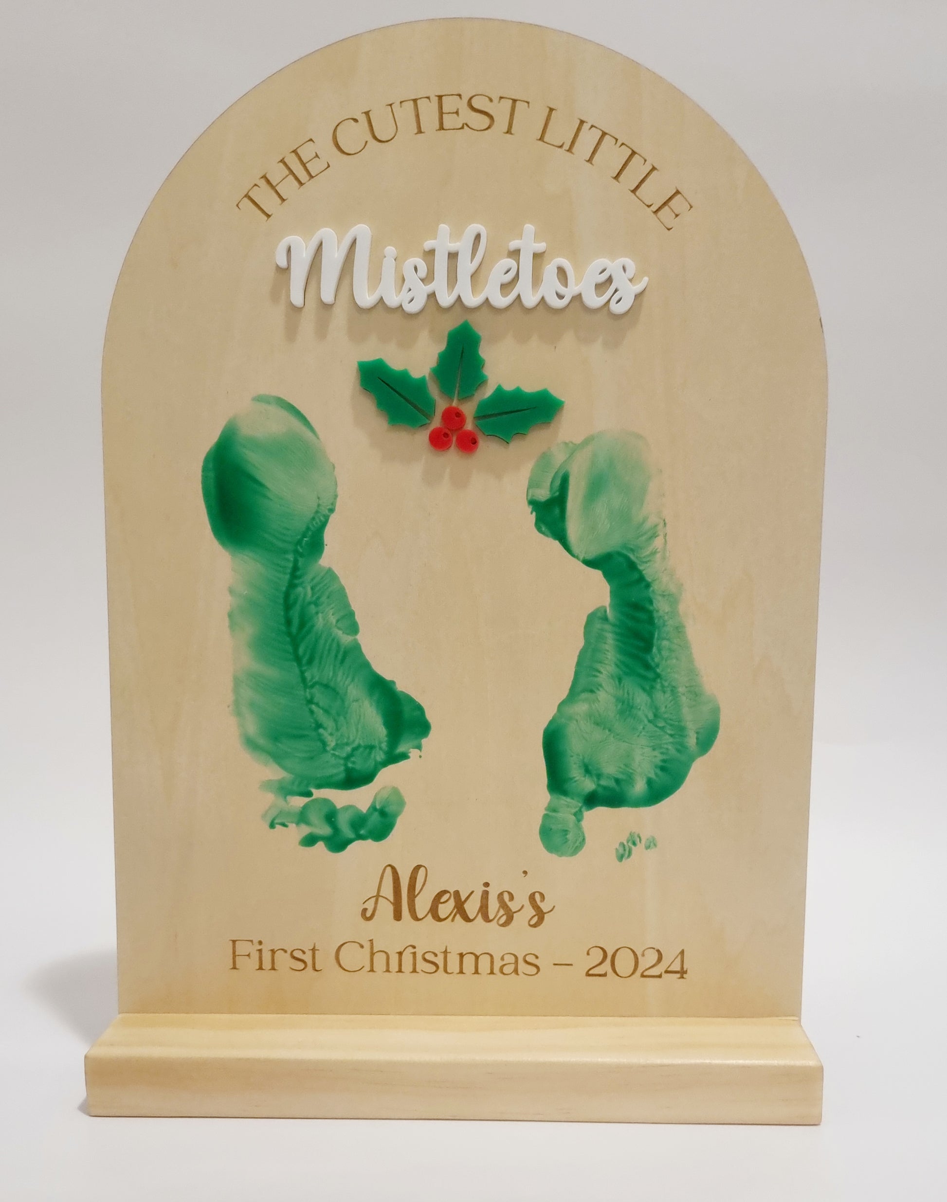 Celebrate your baby's first Christmas with our Mistletoe Plaque. Simply paint their feet and place them on the wooden board for a memorable keepsake. A perfect addition to your holiday decorations.